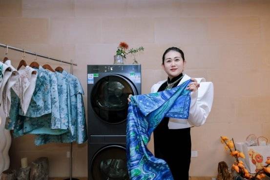 然而,这些面料往往难以打理。非遗刺绣、华服面料极其娇贵,水洗容易缩水变形,干洗又会损伤面料质感,长期以来都是非遗传承中的难题。”现场一位非遗主理人道出困境。卡萨帝洗衣机正为此而来。她搭载的养护湿洗科技,能通过AI精控科技智能匹配进水量与湿洗剂配比,用AI直驱算法以莫比乌斯轨迹轻柔翻转,配合专研湿洗剂产生的绵密泡沫在纤维表面形成保护膜,在实现深层清洁的同时降低物理磨损。洗护后面料光泽如初,纹路清晰立体。